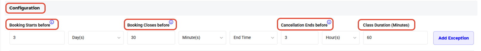 0or leaving it blank allows booking as soon as it’s available online.- Exceptions can be added for different customer types — Member, Client, Lead.