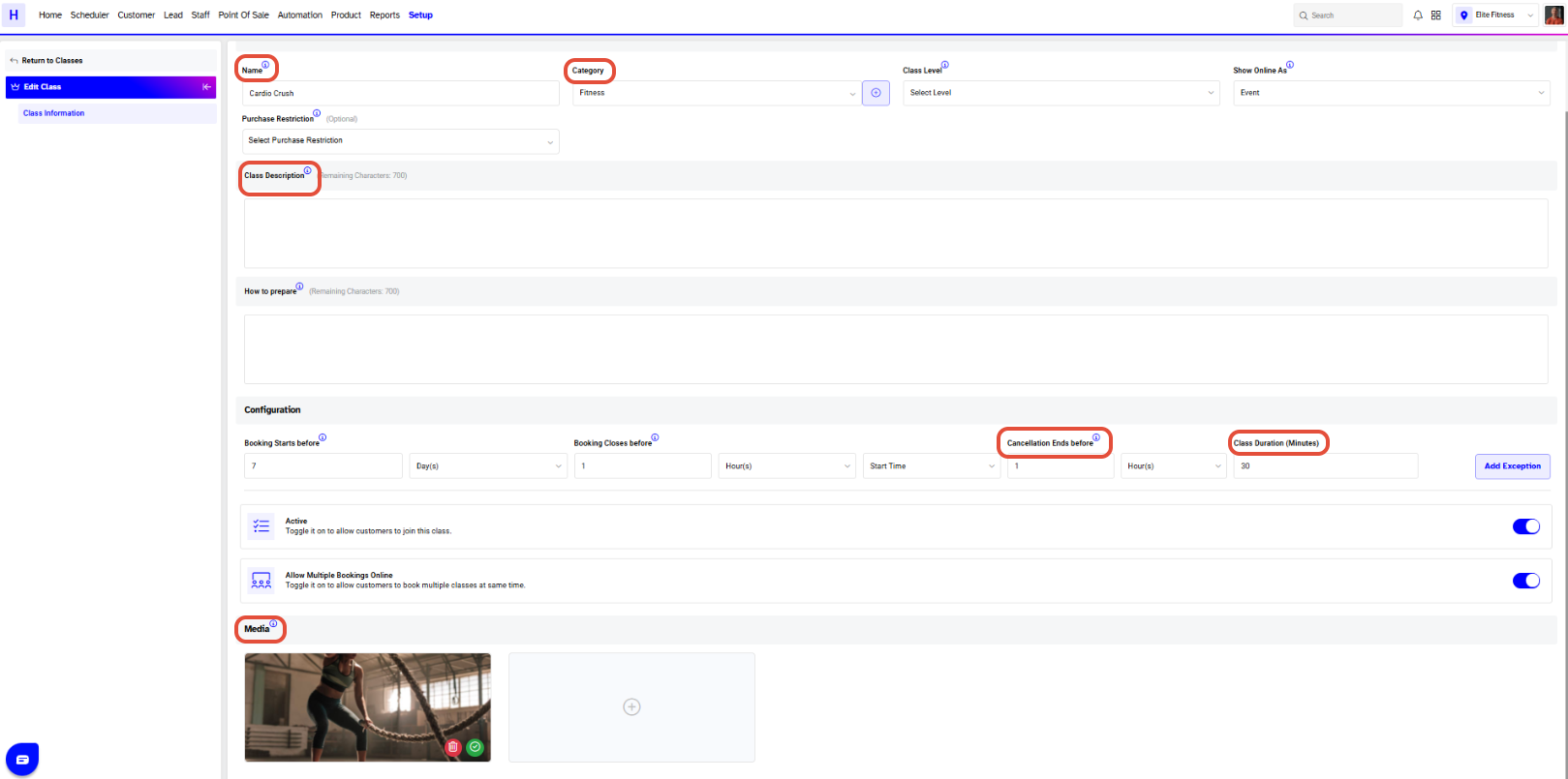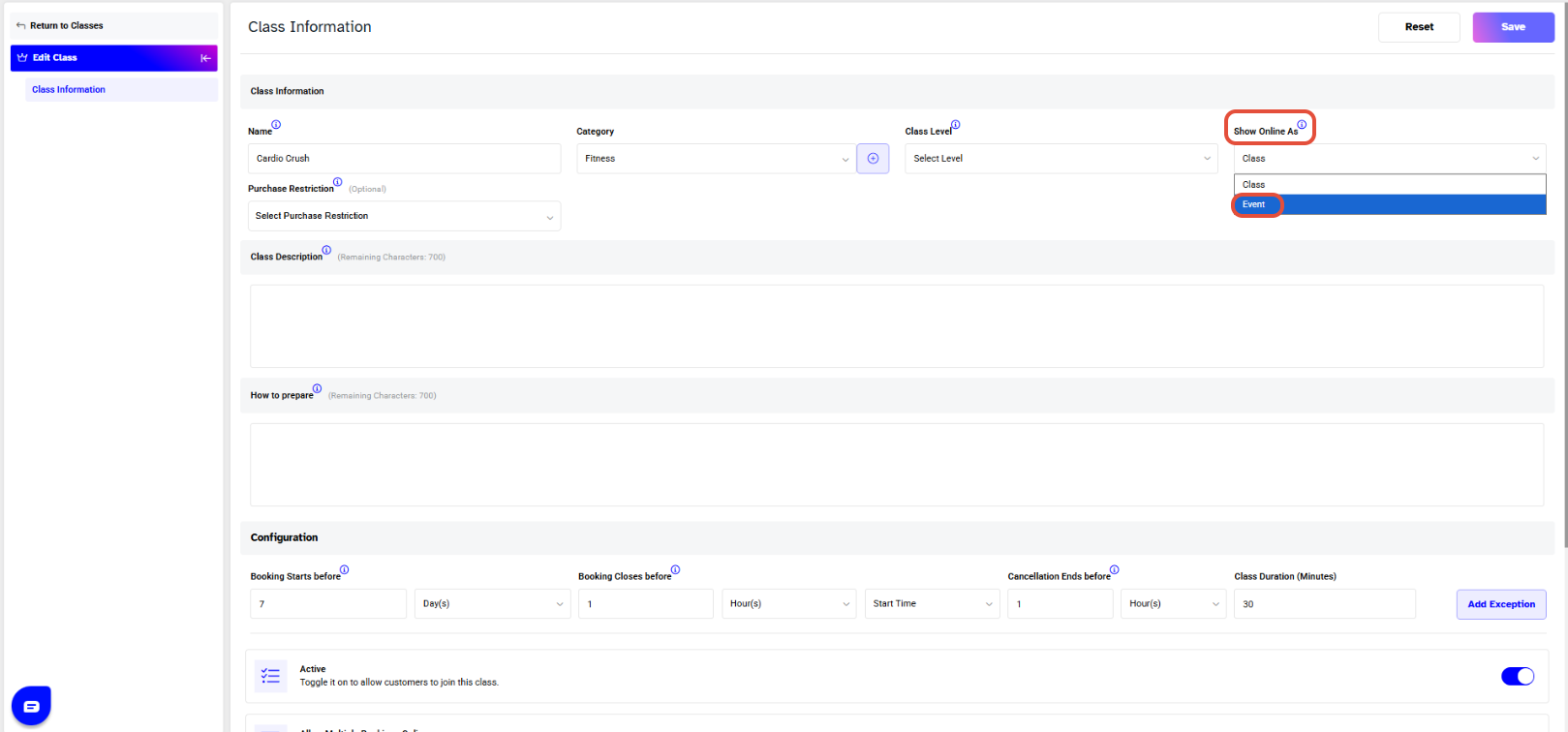 This guide explains how to add an Event in Core. Events are created in the same section as Classes but are displayed differently on the Widget and Customer App. While they appear as Classes in Core, they are shown as Events to customers online.