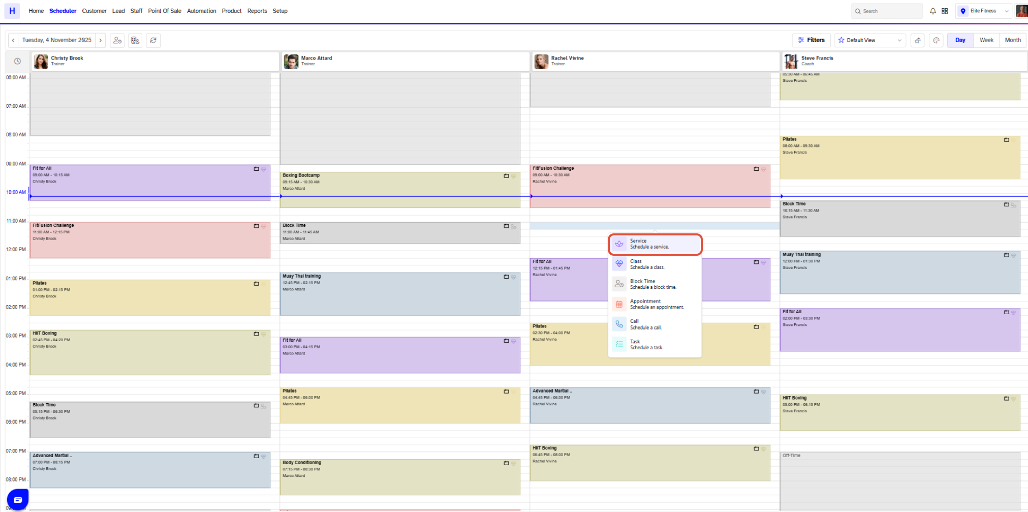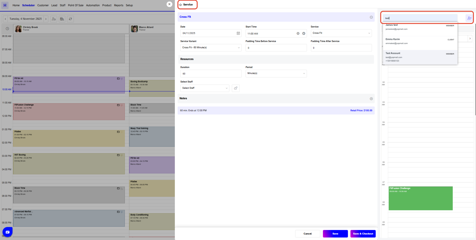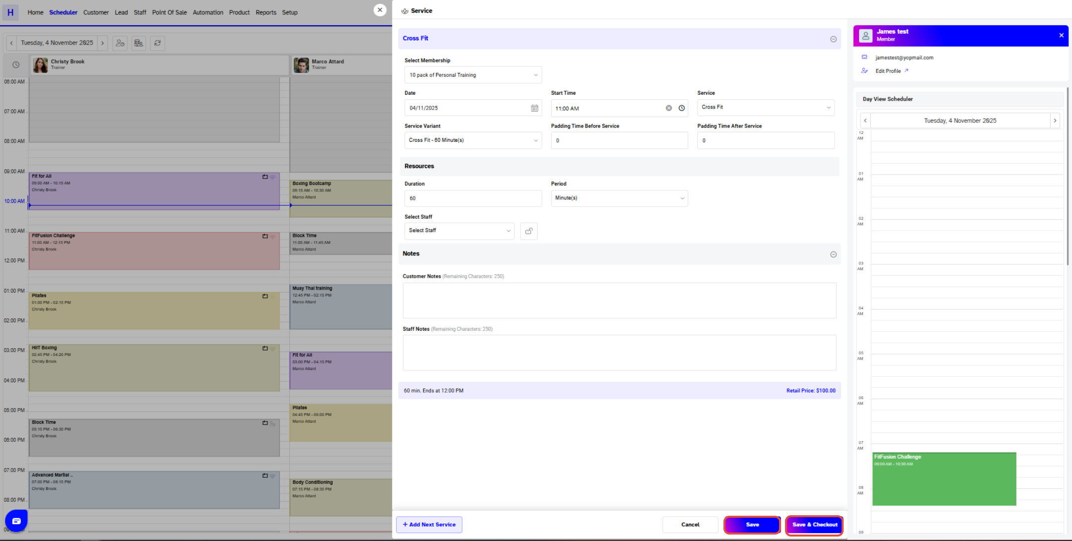 This guide explains how to schedule a service in the Scheduler.It walks you through each step — from selecting a time slot and adding a customer to configuring service details and saving the booking.By following this guide, you can efficiently manage service appointments directly from your Scheduler.