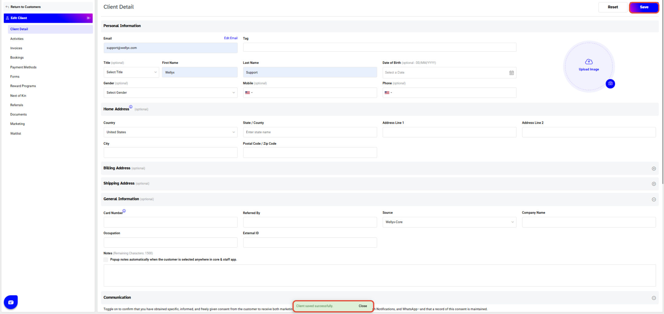 A message “Client Saved Successfully” will appear at the bottom-right of the screen.